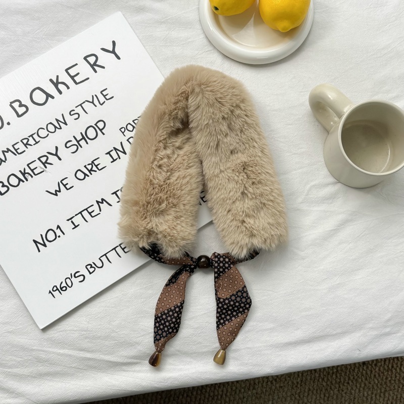 Beaded Silk Scarf Necklace for Women Winter Furry Cross Scarf for Women Imitation Fur Versatile Warm Soft Small Scarf Cute Style