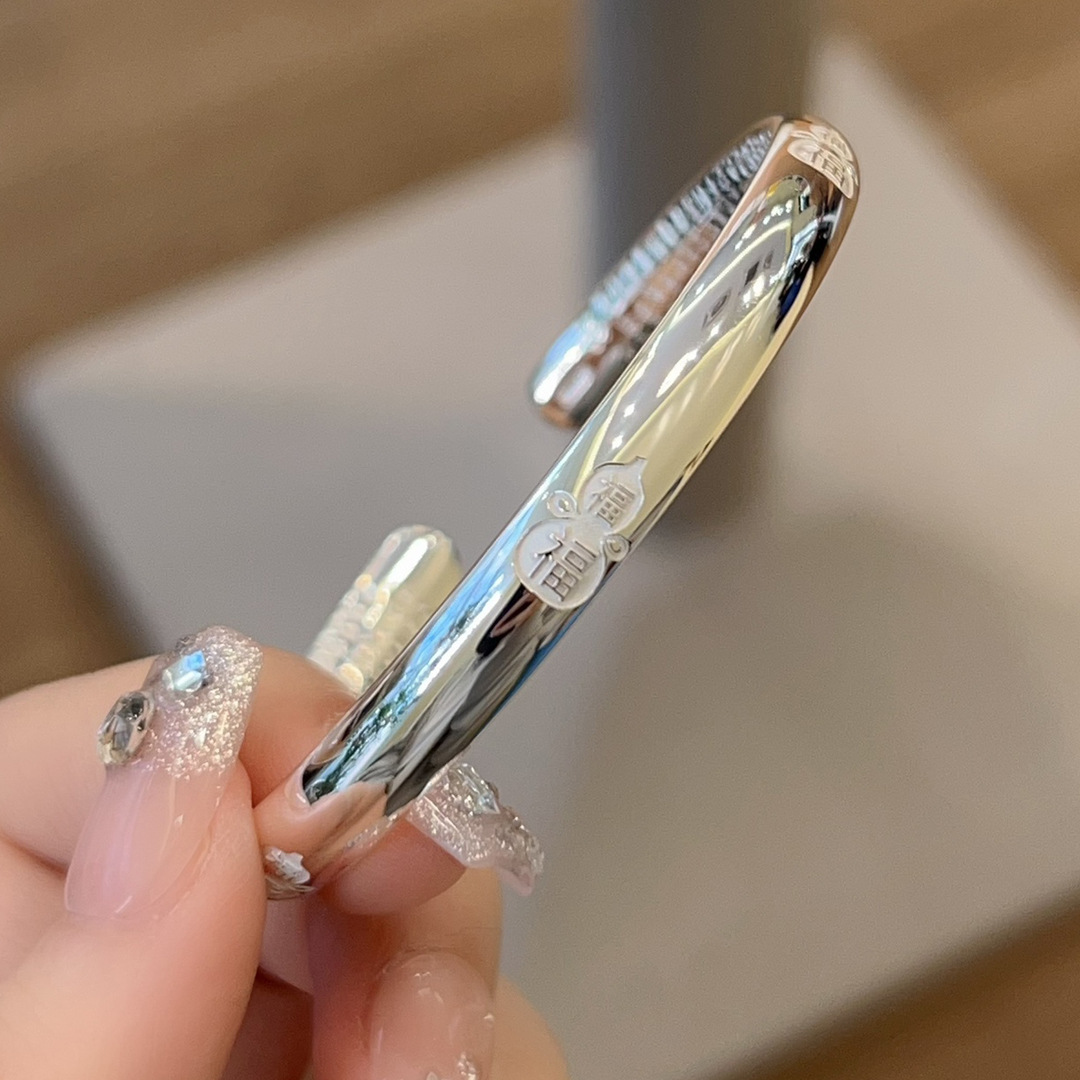 Silver Bracelet for Women, Pure Silver Bracelet, Pure Silver 9999, Gourd Blessing Character, Smooth Heart Sutra Opening, Solid and Thick, Chinese Style Silver Jewelry