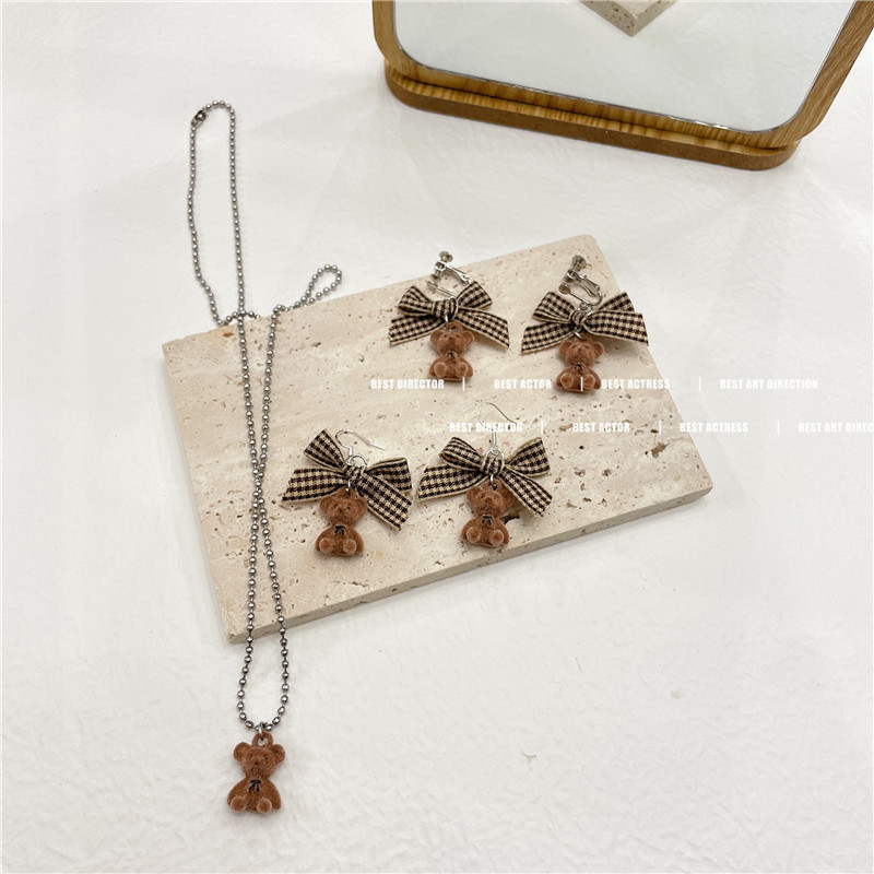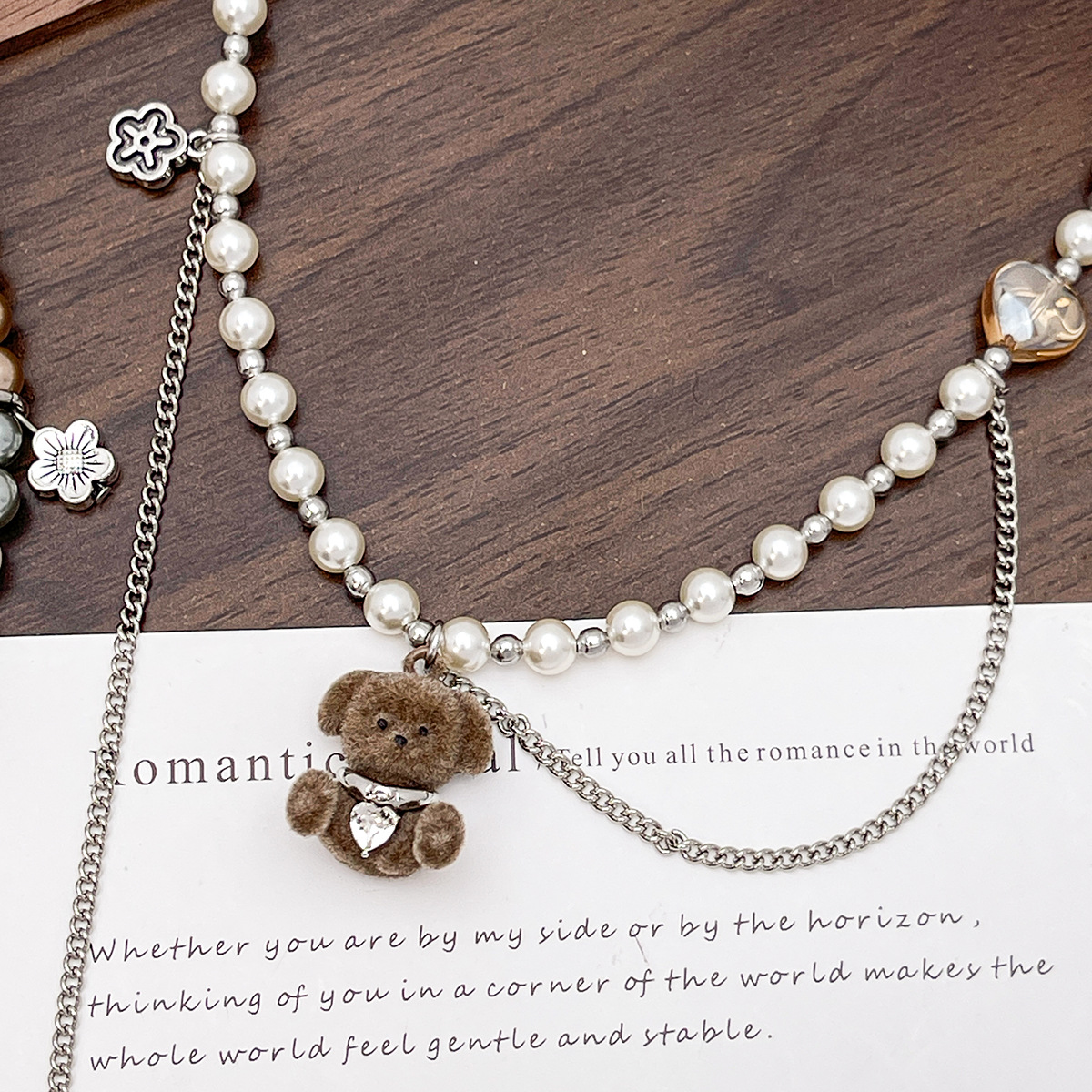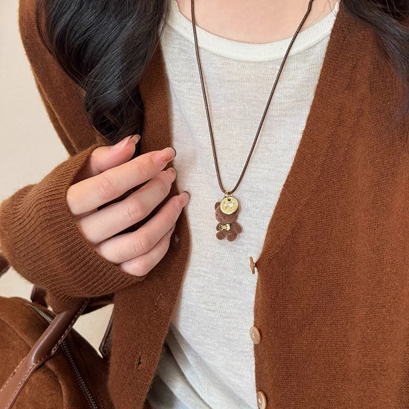 Autumn and Winter Bear Flocking Pendant Necklace Women's Cute Cartoon Long Sweater Chain Accessories Maillard Brown Sweater Chain