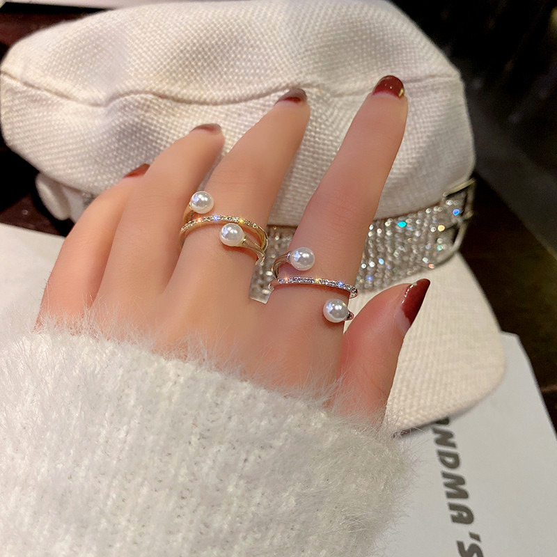 Double-layer Cross Pearl and Diamond Food Finger Ring Fashionable Simple Personality Ring Women's Instagram Popular Online Fashion Elegant Finger Ring