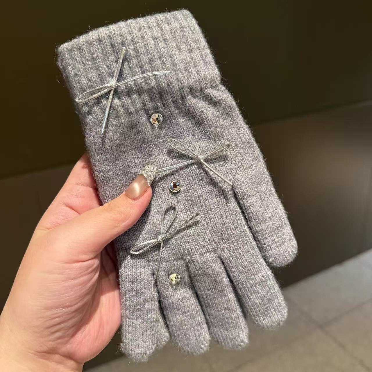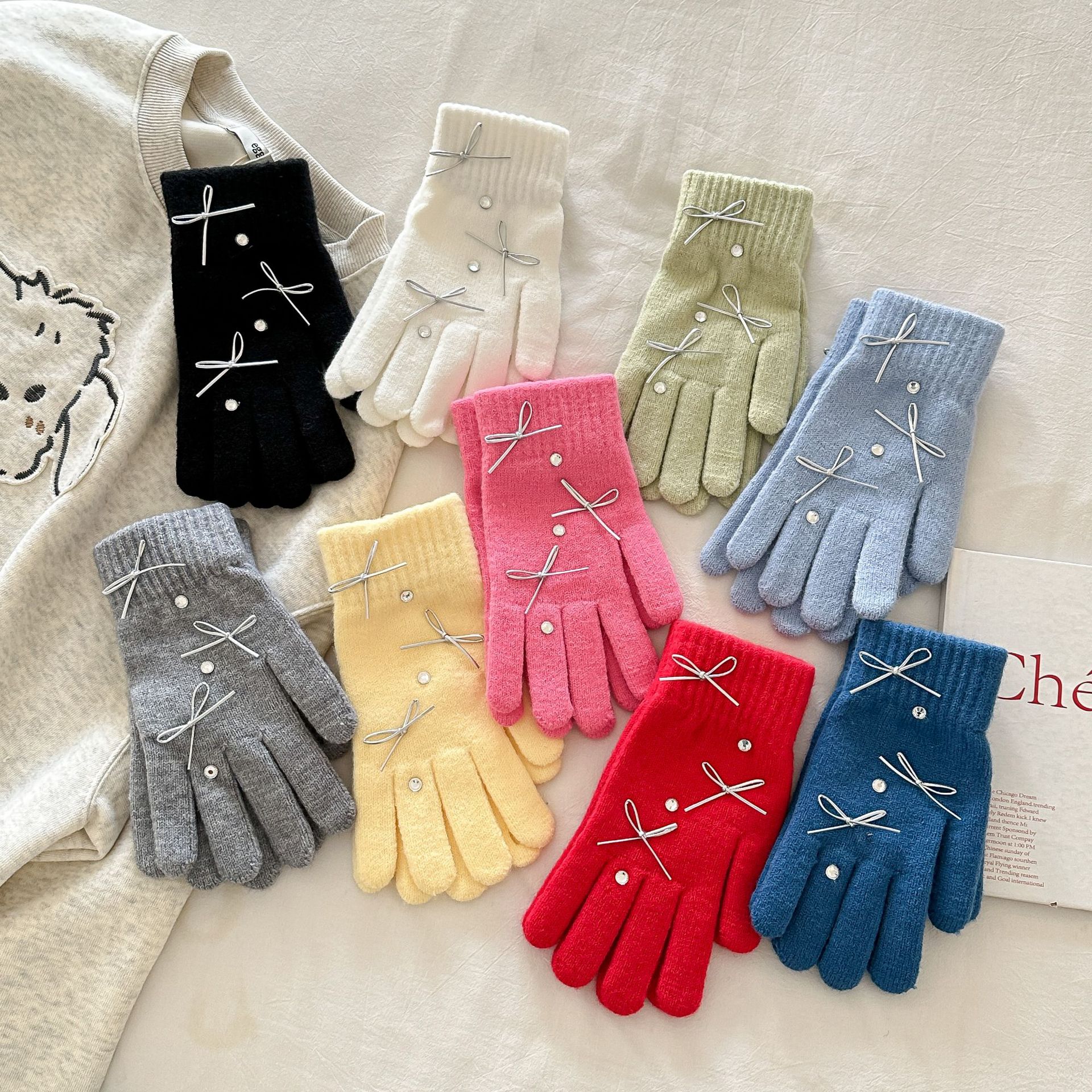 Diamond Bow Decoration Multicolor Five Finger Knitted Gloves Women Winter Cute Cold Proof Outdoor Riding Gloves