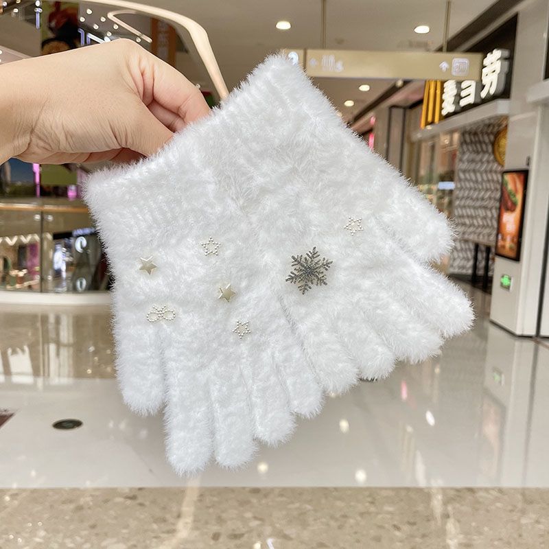Cute Star Gem Plush Five-Finger Gloves for Female Winter Students Warm Cycling Touch Screen Wool Knitted Gloves Trendy
