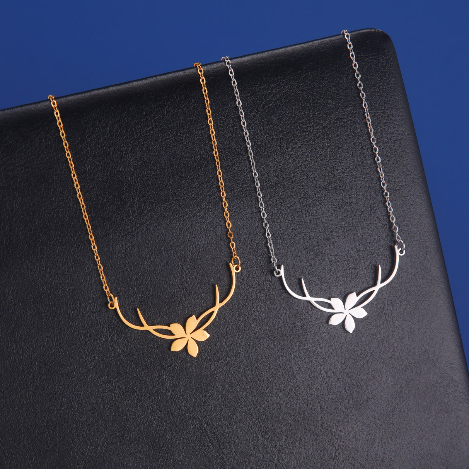 Hot Titanium Steel Niche Design Simple Mori Style Small Clear Antlers Floral Shape 304 Material Stainless Steel Necklace