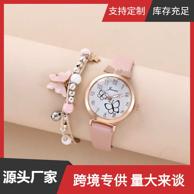 Clear Girly Heart Simple Butterfly Belt Quartz Watch + Bracelet (2Pcs/Set) Gift Rose Gold