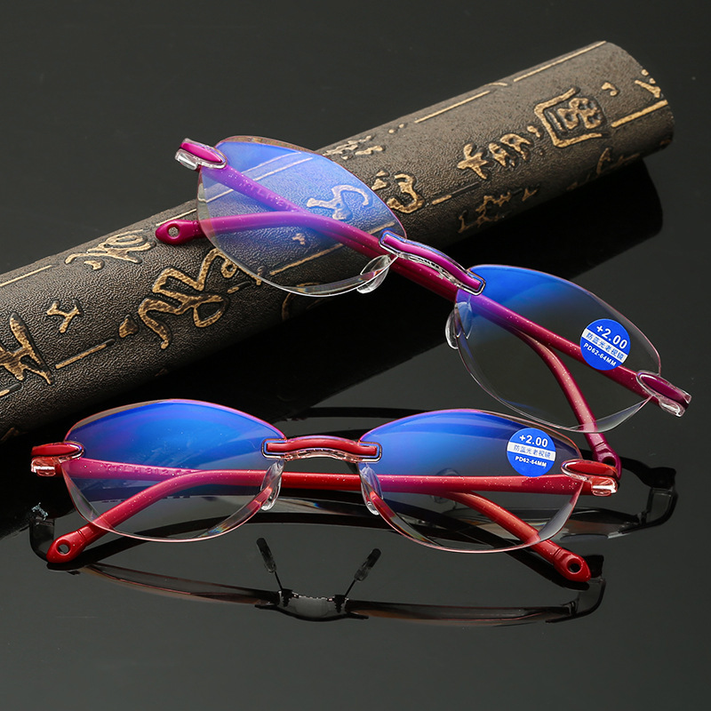 Factory wholesale fashion frameless diamond trimming presbyopic glasses high definition anti-blue light one women's old sight glass 812