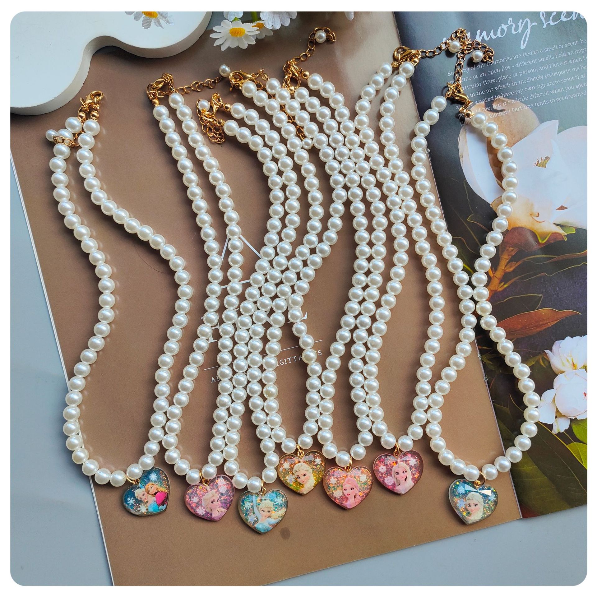 Fashionable and Clear Korean Style Girls Imitation Pearl Heart Princess Necklace Baby Student Ice and Snow Pendant Kidsren's Jewelry