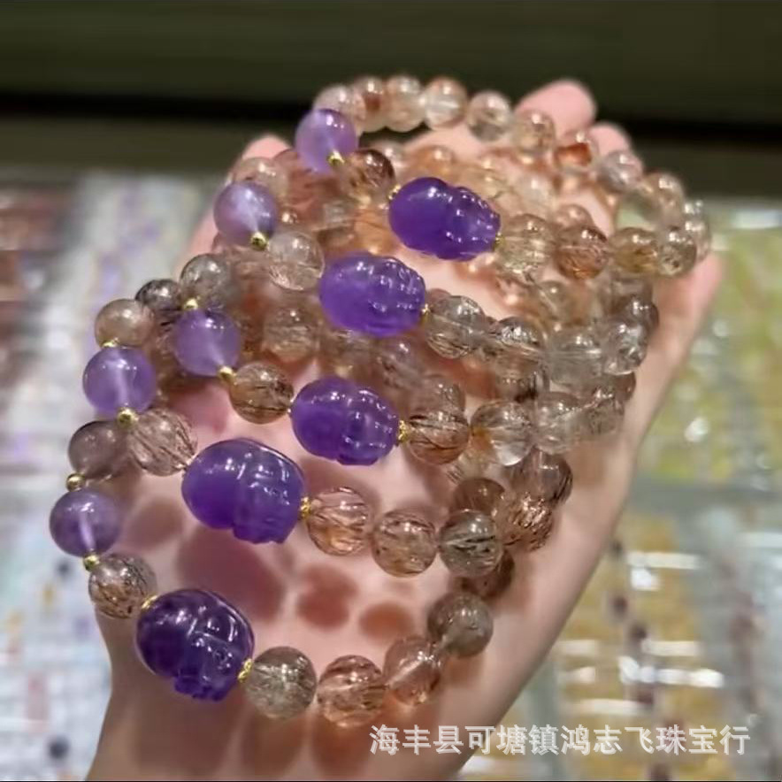 Natural Black Gold Super Seven Amethyst Pixiu Bracelet DIY Model with S925 Silver Accessories with Clear and Transparent Hair