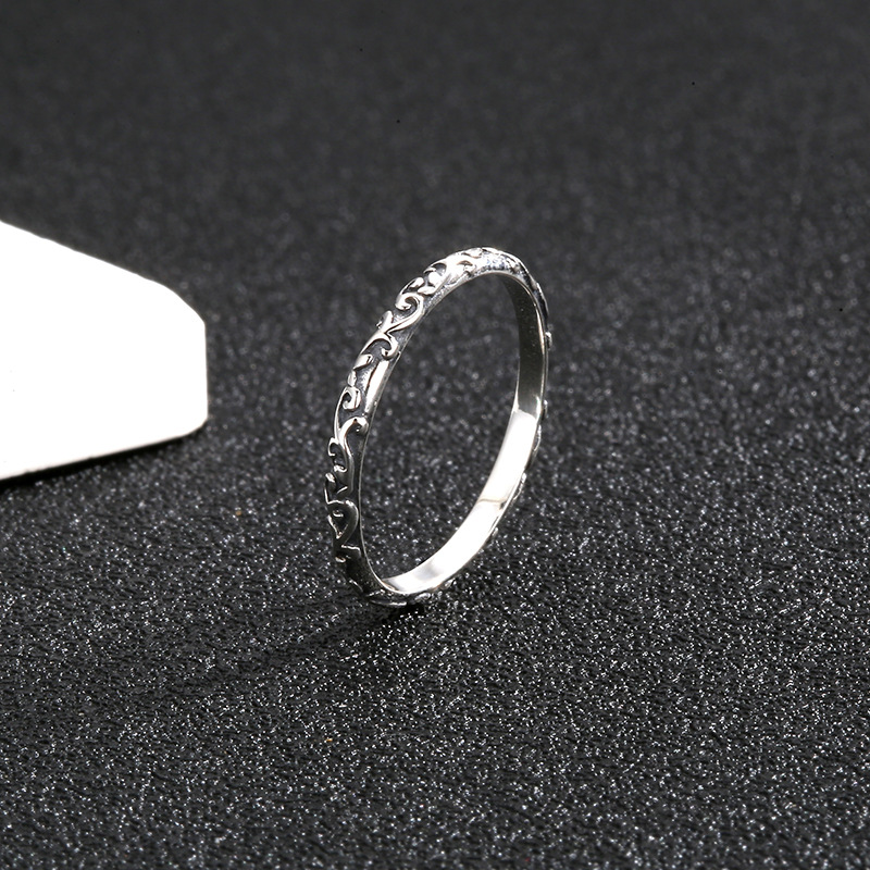 Vintage Carved Pattern All-Body S925 Sterling Silver Ring Women's Simple Small Clear All-Match Index Finger Ring Exquisite Jewelry