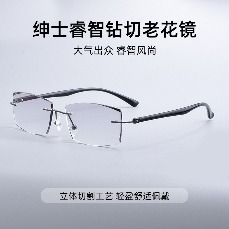 Factory Direct sales high-end frameless diamond cut presbyopic glasses high-definition anti-blue light integrated men's presbyopic glasses
