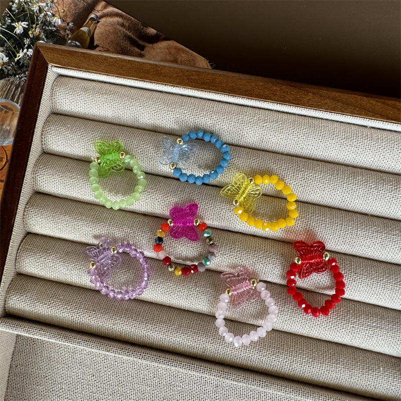 Clear and sweet simple crystal beaded butterfly ring niche design ins powder Joker female ring jewelry wholesale
