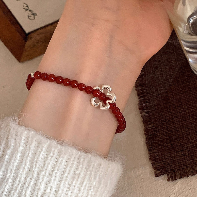 S925 Sterling Silver Natural Red Agate Cut Out Flower Bracelet for Women Simple and High-End Ins Niche Small Clear Hand Jewelry