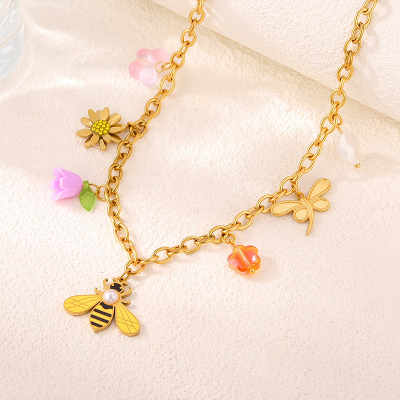 Cross-Border Hot-Selling Pastoral Style Bee Flower Multi-Element Titanium Steel Necklace Women's Personality Sweet and Clear Stainless Steel Necklace