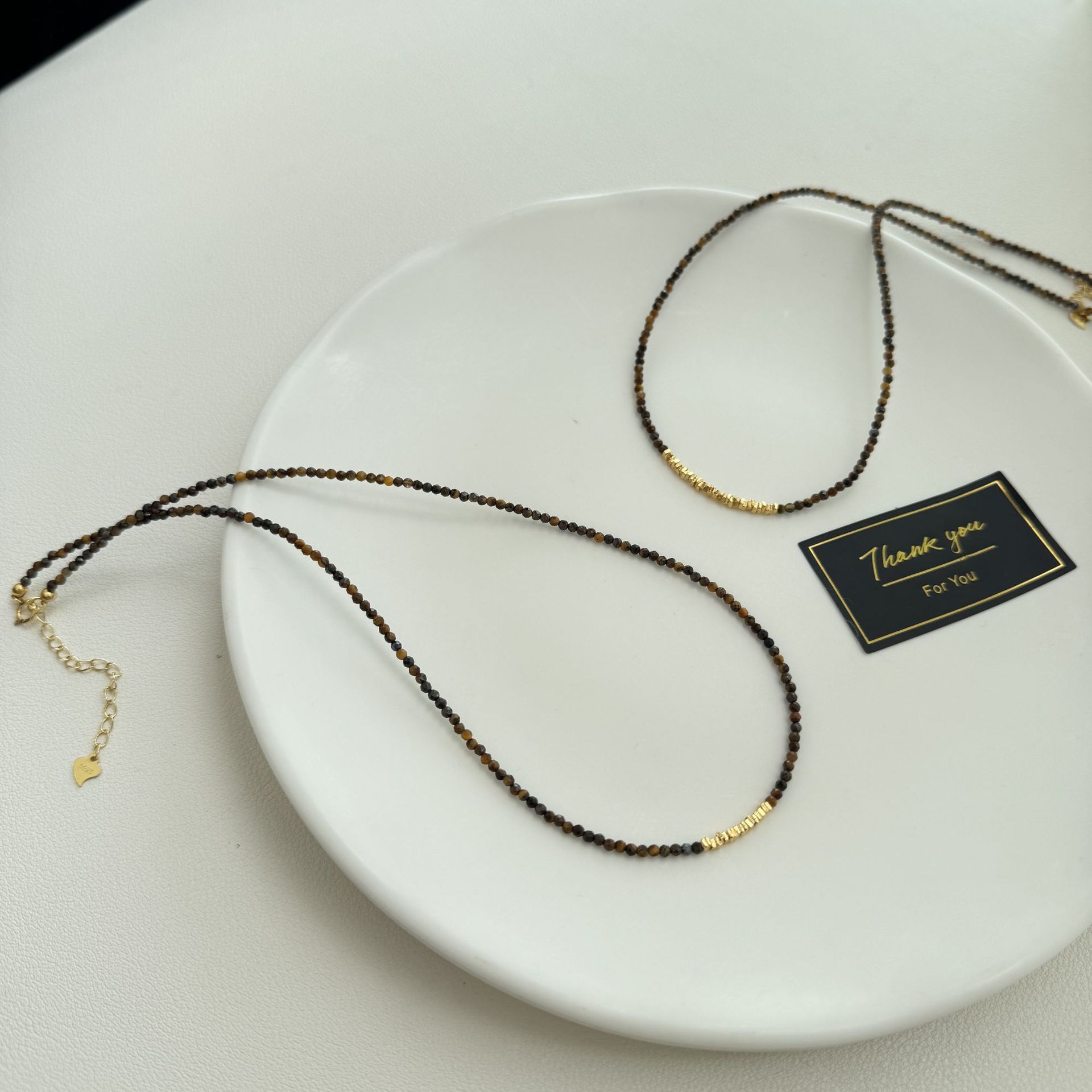 Autumn and Winter 2mm Extremely Fine Cut Natural Tiger's Eye Gold Broken Silver 925 Sterling Silver Necklace Women's Light Luxury Niche Jewelry