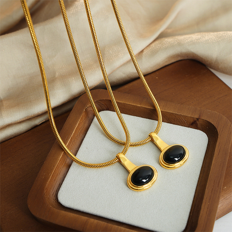 Hong Kong Style Fashion Personality Simple All-match Geometric Jewelry Oval Brand Inlaid Glass Bead Design Titanium Steel Necklace