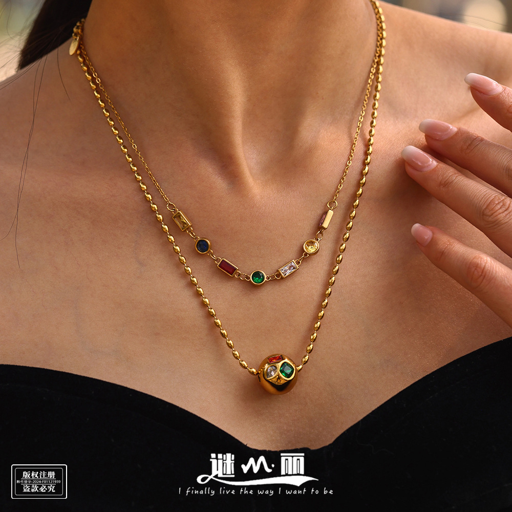 Mystery Light Luxury Ball Inlaid Colorful Zircon Beads Collarbone Necklace European and American Fashion Stainless Steel Necklace Jewelry