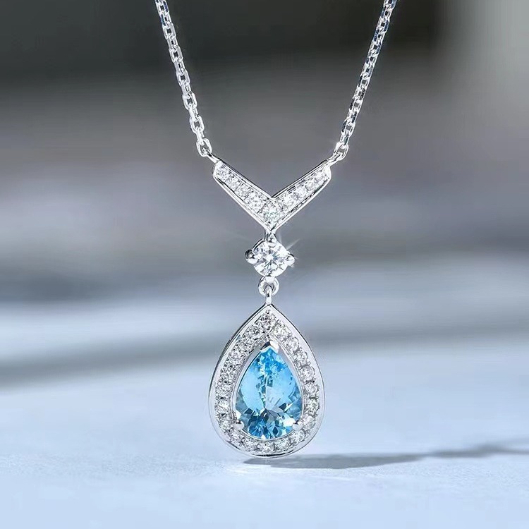 s925 Sterling Silver Blue Water Drop Aquamarine Necklace Women's 2021 Summer Small Fresh Raw Stone Clavicle Chain