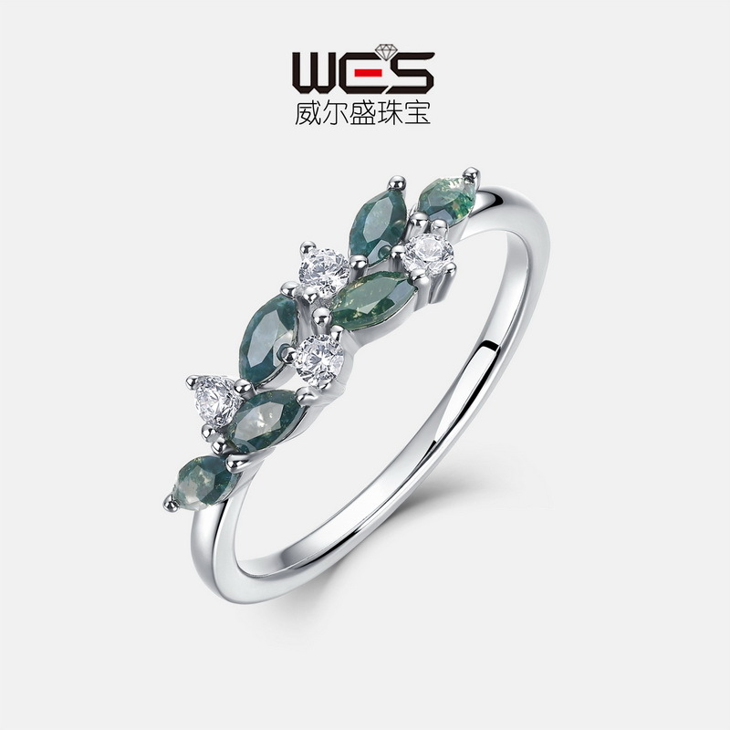 Cross-border Small Fresh Geometric Leaves Green Moss Stone Ring S925 Silver Natural Aqua Grass Agate Finger Ring Simple