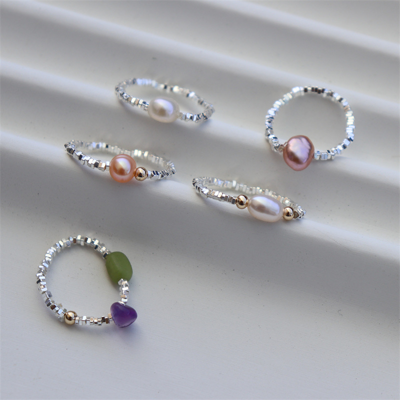 suu new niche cool style color-preserving broken silver natural freshwater pearl elastic natural stone ring