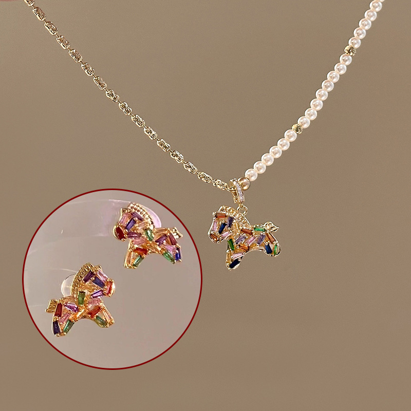 Colorful Crystal Zircon Dopamine Pony Pendant Pearl Necklace Accessories Women's Autumn and Winter Sweater Chain High-End Jewelry