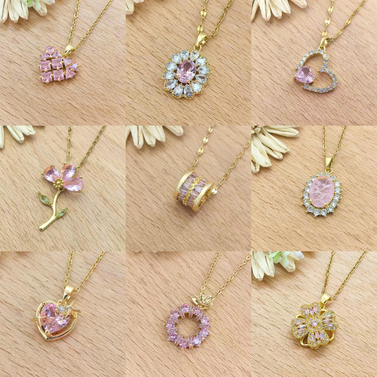 High-End Women's Accessories, Fashionable Necklace, Copper Pendant with Pink Glass and Stainless Steel Elegant Clavicle Chain Jewelry