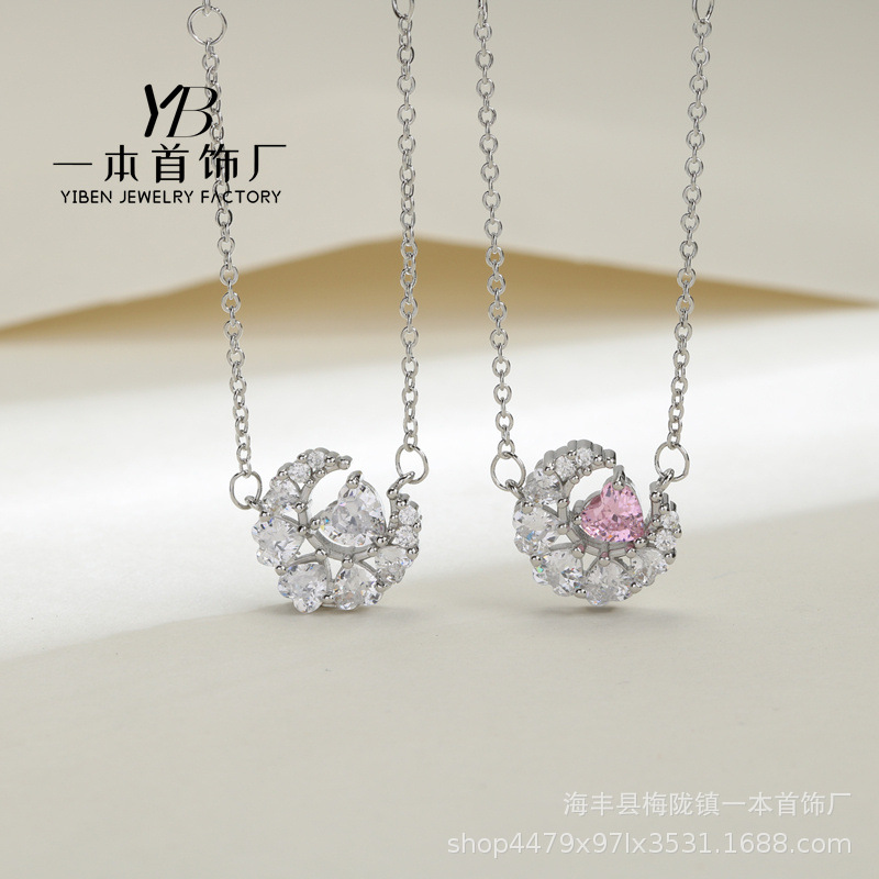 A Fantasy Dream Heart and Moon Necklace for Women, Niche Design, Pink Heart and Moon Clavicle Chain, Wholesale, Eco-Friendly Copper Material