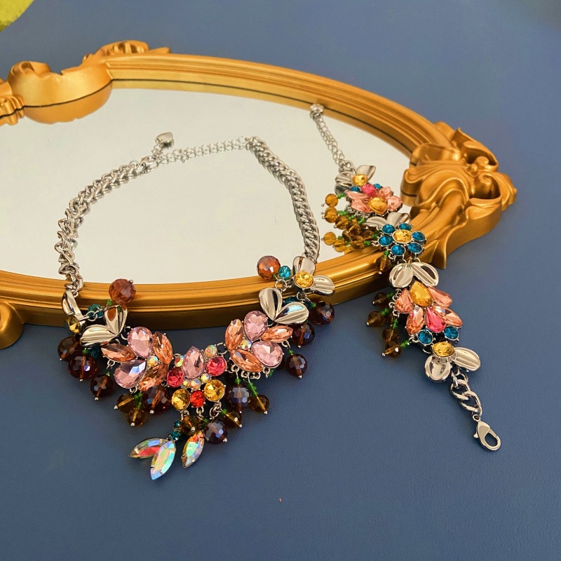 Vintage Fashion Floral Crystal Gemstone Colorful Palace-Style Standard Gemstone Inlaid Necklace and Bracelet
