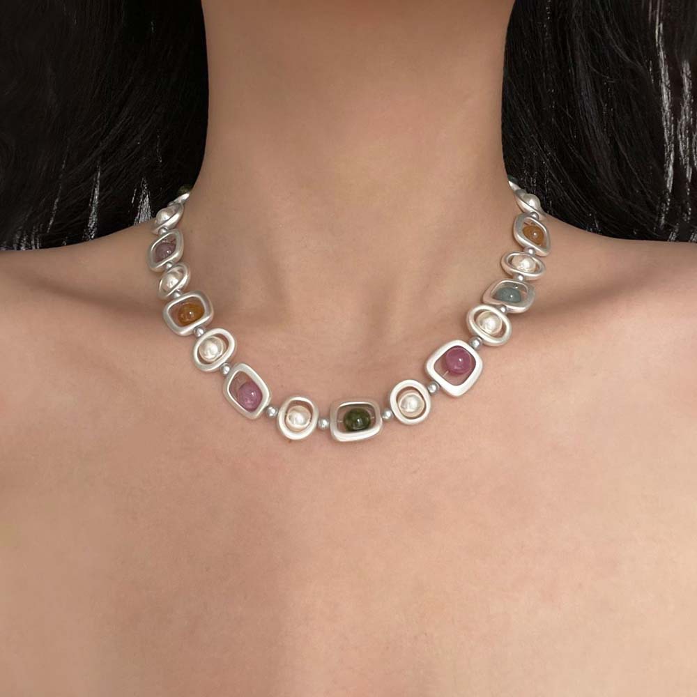 Irregular Geometric Square Metal Colorful Beaded Necklace Women's Accessible Luxury High-End Fashion Unique Clavicle Chain Necklace