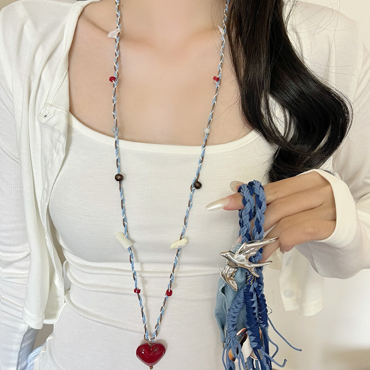 Retro Colorful Braided Rope Red Heart Necklace Niche Design Natural Stone Beaded Sweater Chain Fashion Necklace
