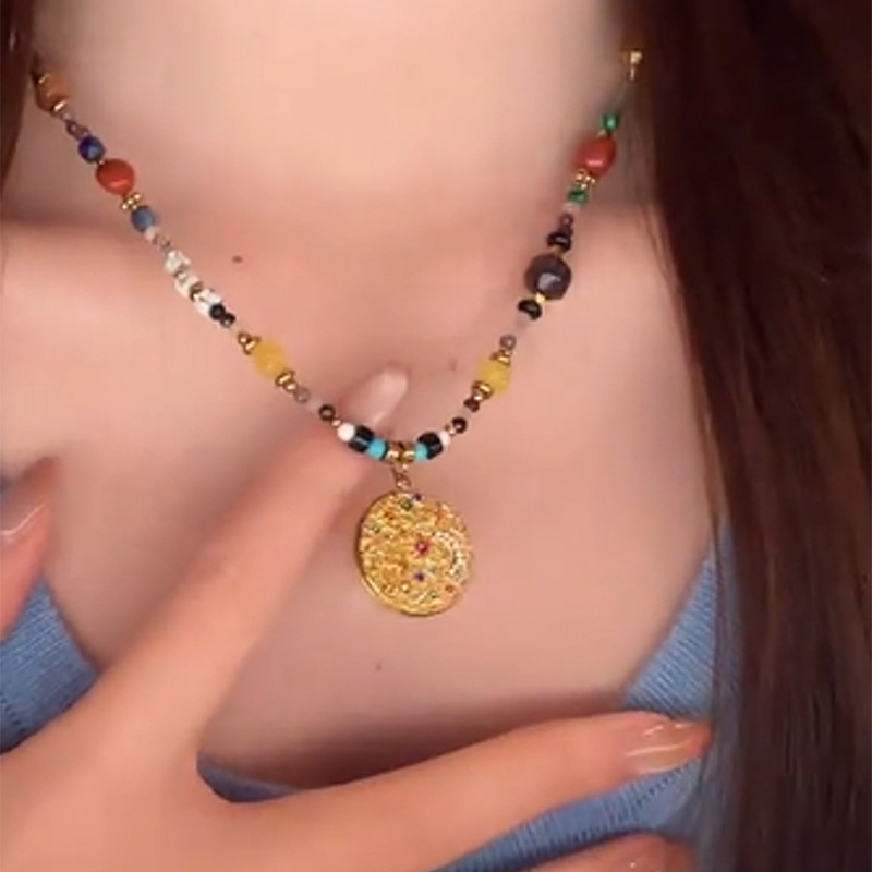 Hanluo~Colorful Stone Beaded Round Pendant Necklace Ethnic Style Fashion Clavicle Chain Work Clothing Versatile Necklace for Women