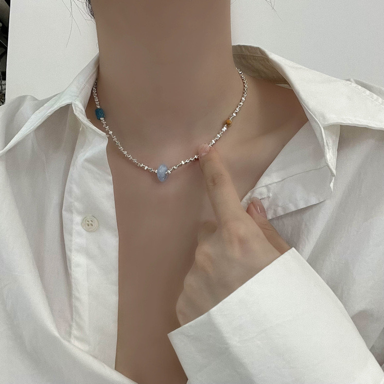 Broken Silver Color Beaded Stitching Necklace Girls High Design Sense Niche Necklace Cold Wind Sweet Cool Clavicle Chain