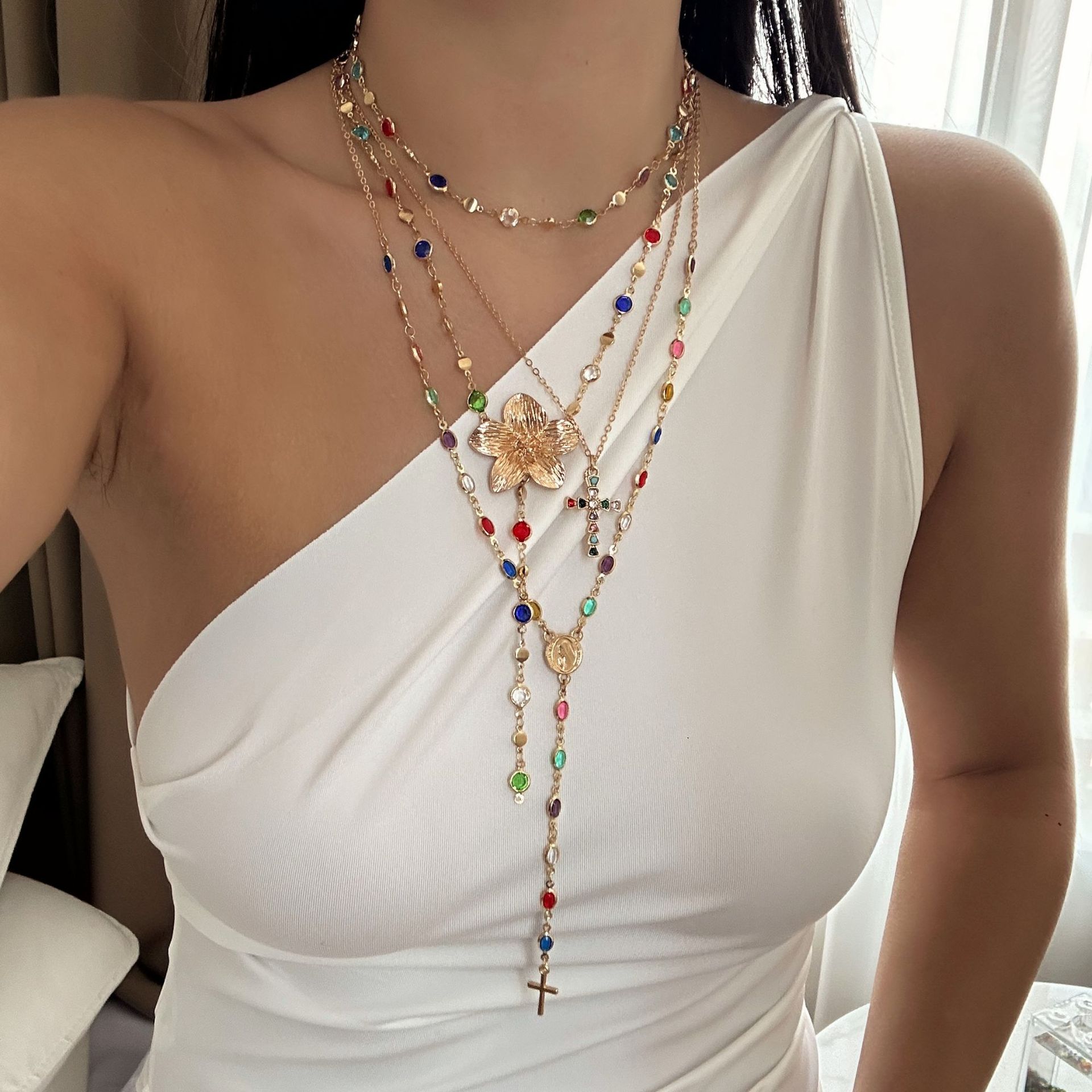 European and American Cross-Border Jewelry, Elegant Colorfulful Rhinestone Stacked Long Necklace, Cool Style Metal Thin Chain Tassel Necklace