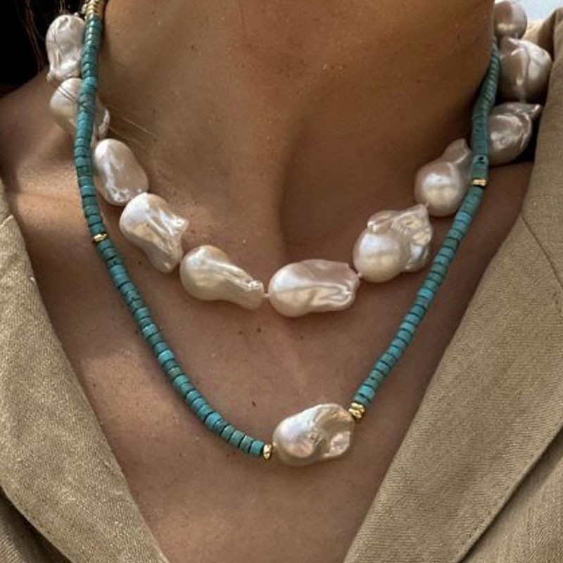 Natural Baroque Pearl Turquoise Gold Necklace Colorful Rice Beads Niche Independent Design Feeling Hand-made All-match Trend