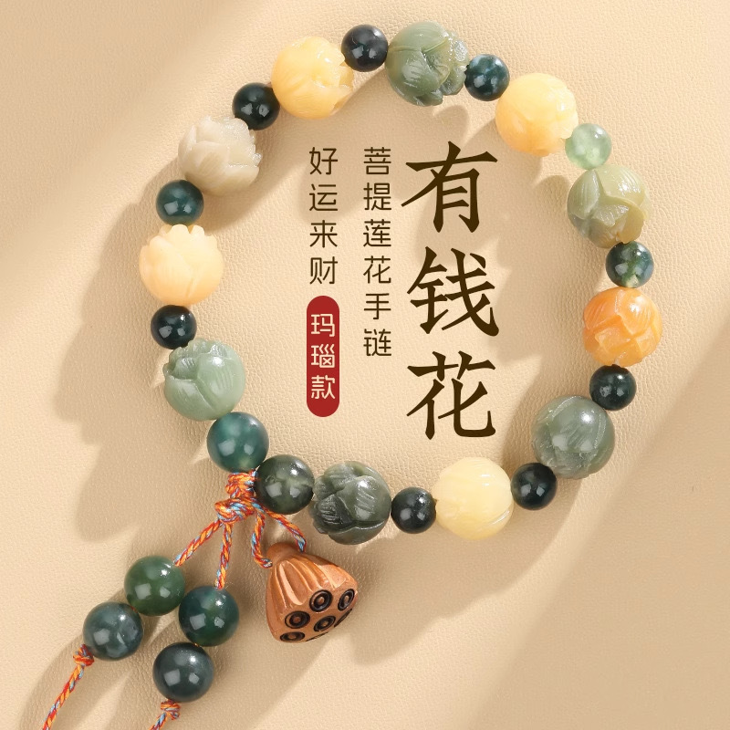 Hand-Carved Bodhi Lotus Bracelet with Green Sandalwood and Colorful Agate, Available on All Major Platforms
