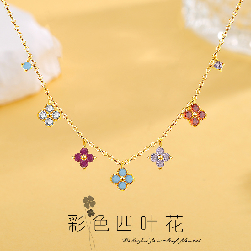 Four-Leaf Clover Fashion Pendant Necklace Inlaid with Colorfulful Zircon Dopamine Style Design Exquisite Necklace Women's Clavicle Chain