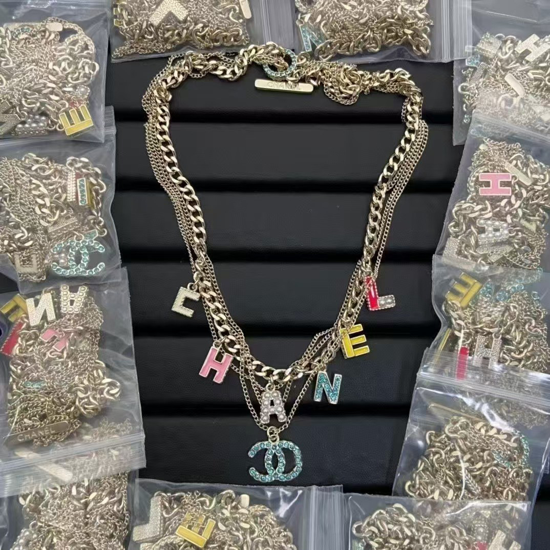 26C New Double C Colorful Letter Necklace for Women, Fashionable and Versatile, Chanel-Style Jewelry, Light Luxury Style, Factory Wholesale
