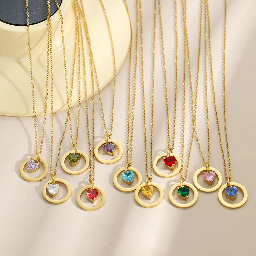 Amazon Cross-Border Colorful 12 Birthstone Inlaid Heart Stainless Steel Zircon Necklace Versatile Simple Jewelry Wholesale