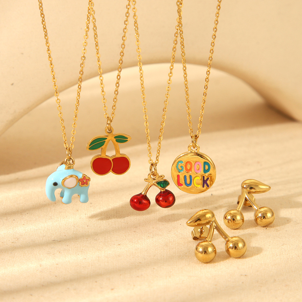European and American Cute Fruit Pendant Necklace Gold Plated Stainless Steel Color Oil Drop Elephant Cherry Goodluck Necklace Women