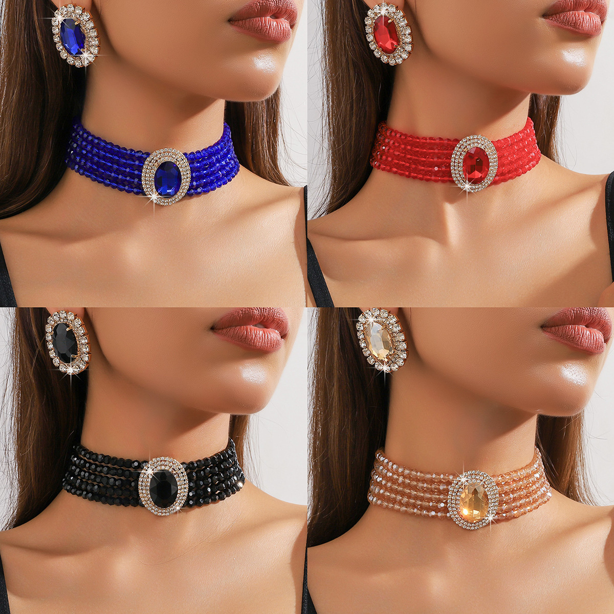 Cross-Border Foreign Trade Supply European and American Exaggerated Multi-Layered Crystal Colorful Oval Geometric Large Crystal Necklace Necklace for Women