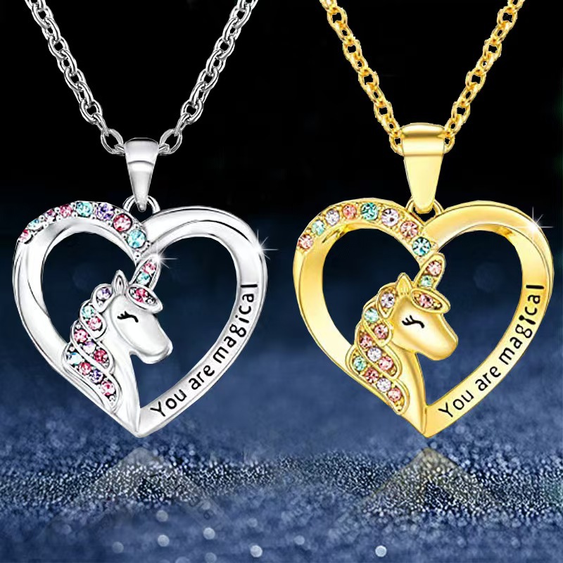 Europe and the United States cross-border creative new unicorn necklace Amazon colorful heart-shaped pony children's love rhinestone pendant
