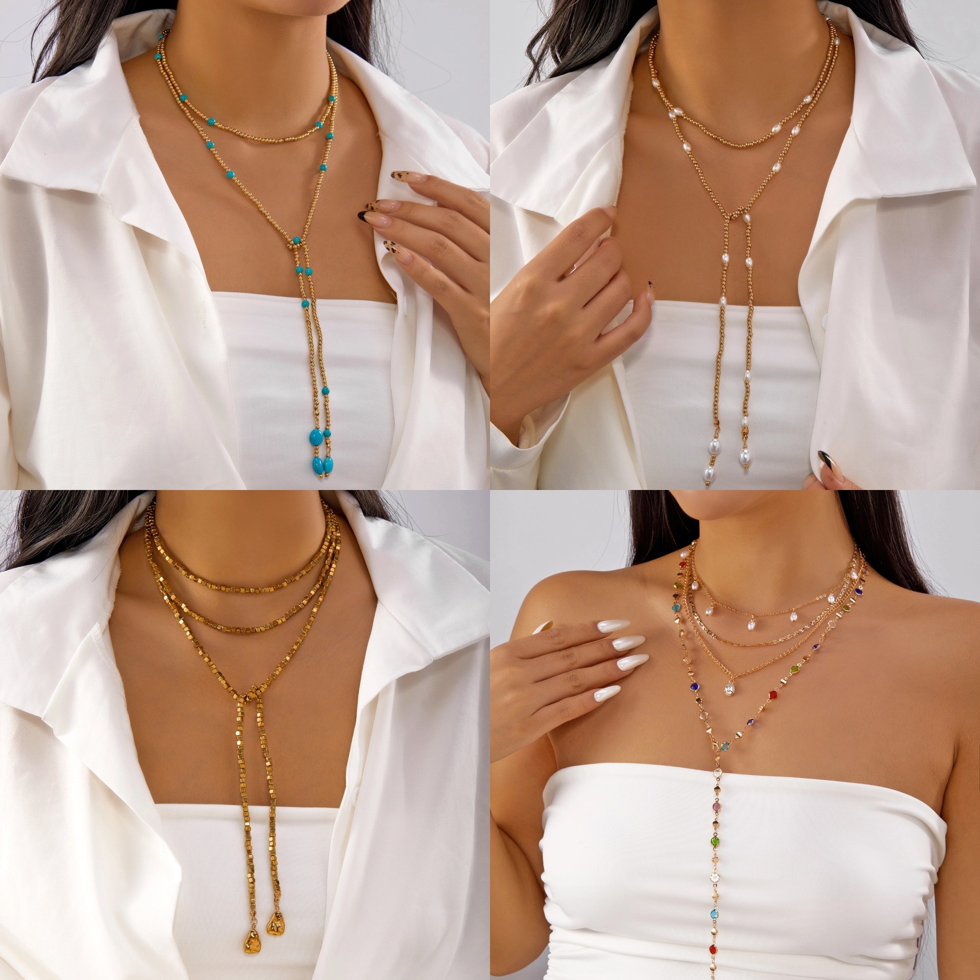 Long Tassel Necklace Collection Ccb Beaded Pearl Turquoise Wrap Necklace Colorfulful Oil Dripping Y-Shaped Multi-Layer Necklace