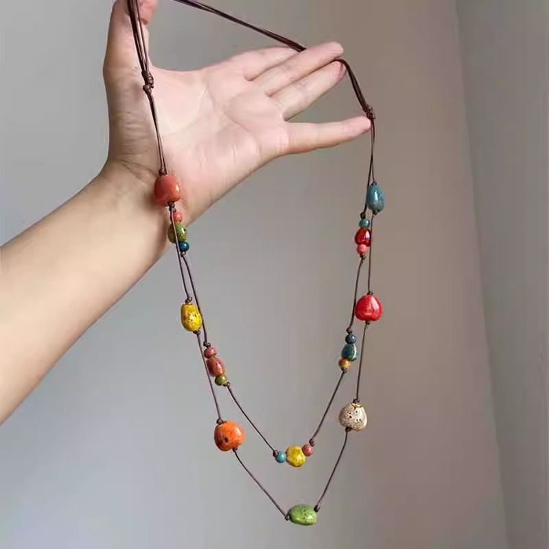 Ethnic Style Colorful Love Beaded Necklace Women's Niche High-End Brown Braided Rope Double-Layer Clavicle Chain