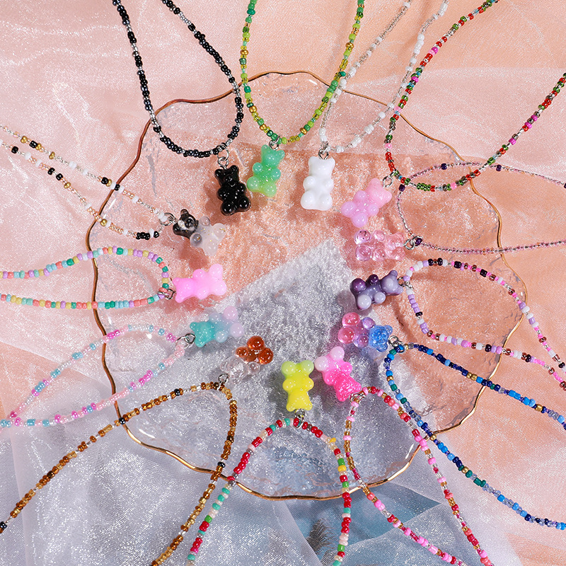 Cute Bear Rice Bead Necklace Color Beaded Necklace European and American Women Bohemian Style Pendant Wholesale