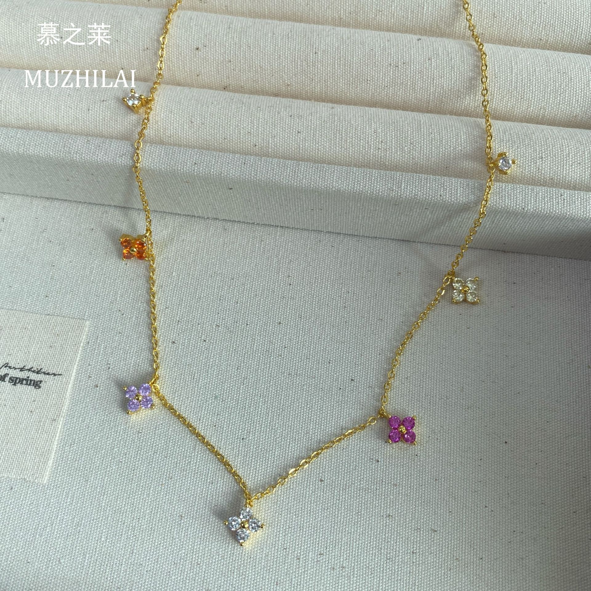 Colorful Dopamine Four-Leaf Clover Zircon Necklace Women's Accessible Luxury Niche High-End Clavicle Chain Exquisite Versatile Accessories