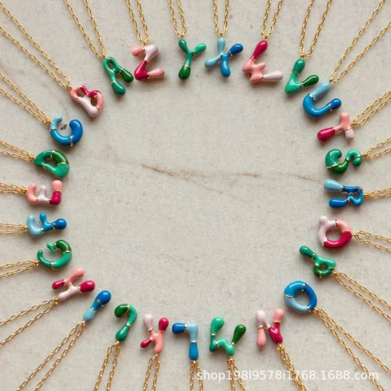 European and American Cross-Border Colorful Oil-Dropping Dopamine Capsule English Letter Pendant Stainless Steel 26 Bubble Letter Necklace