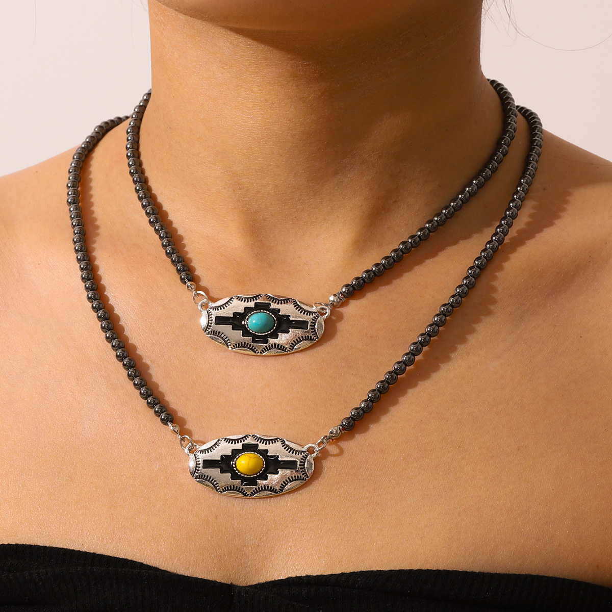 European and American Cross-border New Retro Inlaid Color Turquoise Alloy Necklace Bohemian Style Simple Niche Jewelry