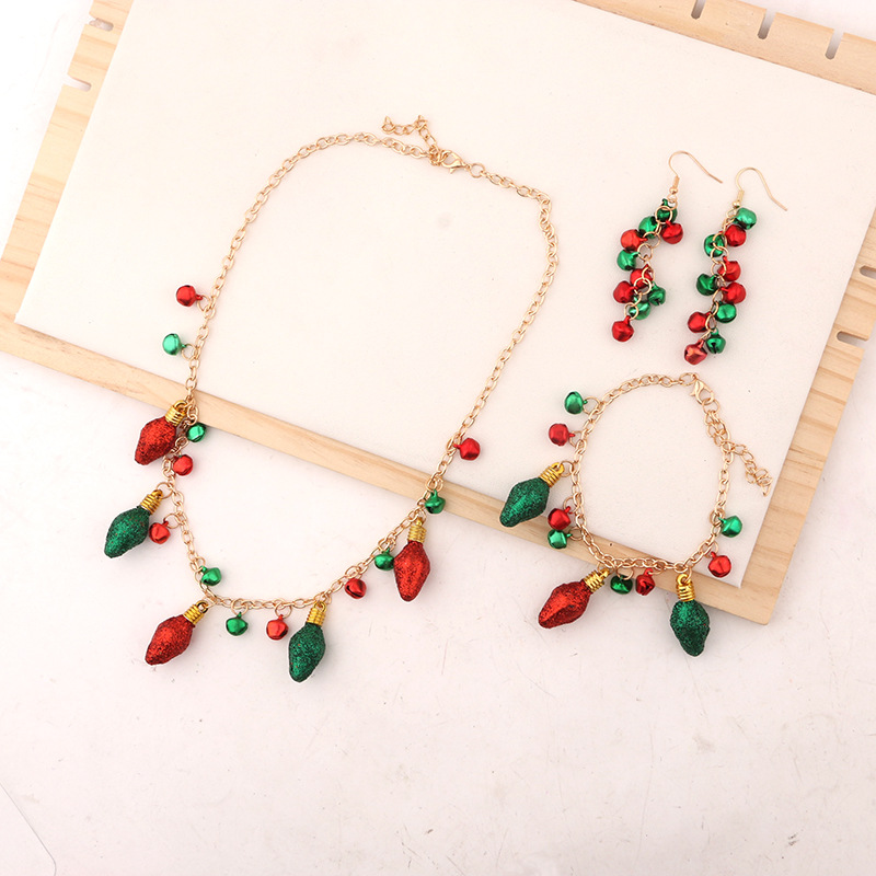 European and American Cross-Border Women's Christmas Bell Three-Piece Set Light Bulb Thick Collar Necklace Bell Bracelet Colorful Bell Earrings