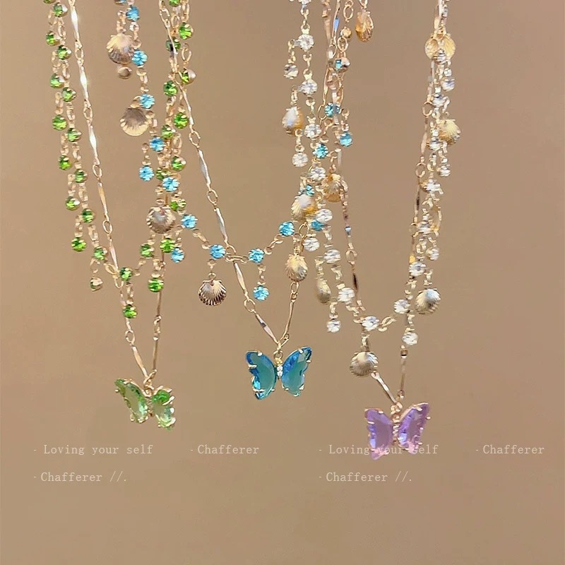 Colorful Butterfly Double-Layer Tassel Necklace Summer Cool Choker Necklace Accessories Female Niche Clavicle Chain