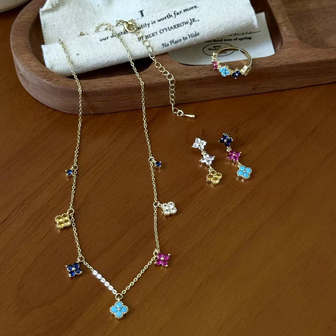 Colorful Zircon Rhombus Four-Leaf Flower Pendant Tassel Ring Earrings Necklace Fashion Exquisite Light Luxury Necklace Accessories