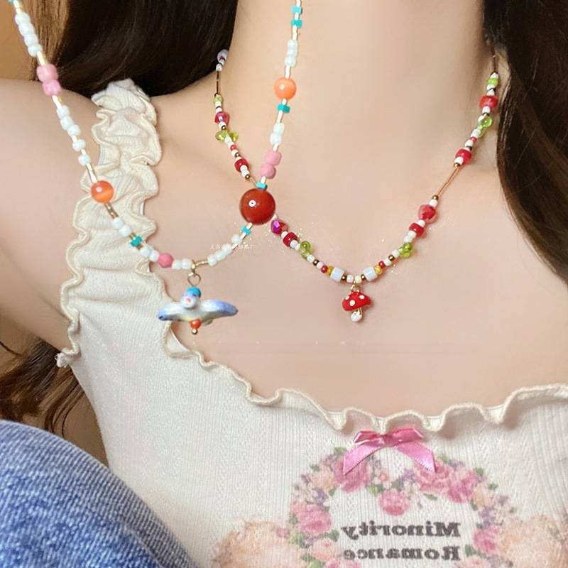 Colorful Mushroom Rice Beads Necklace Women's Summer Niche Design Clavicle Chain Cute Retro Necklace Chain