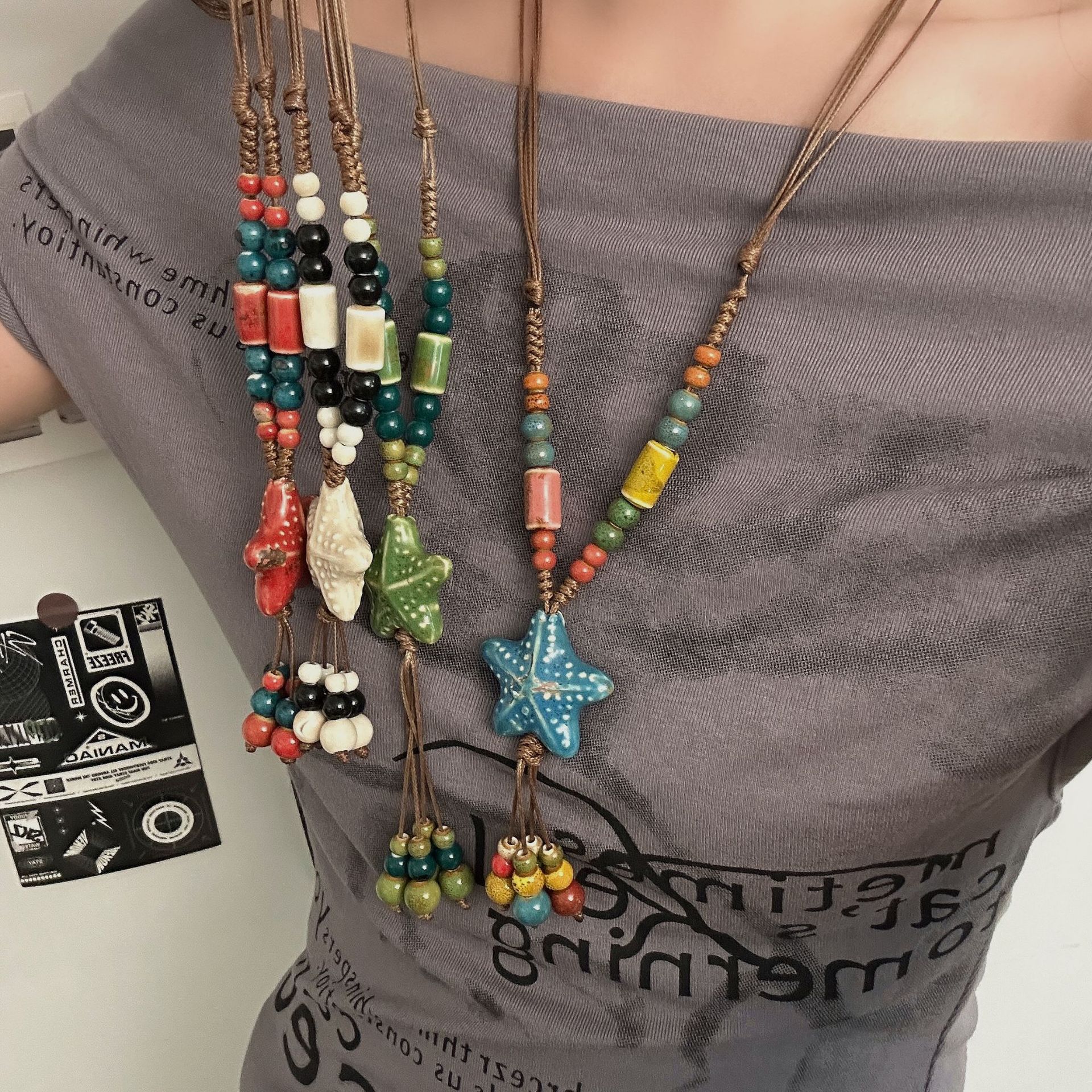 New Chinese Style Bohemian Ceramic Colorfulful Bead Star Necklace Women's Retro Ethnic Style Braided Long Accessories